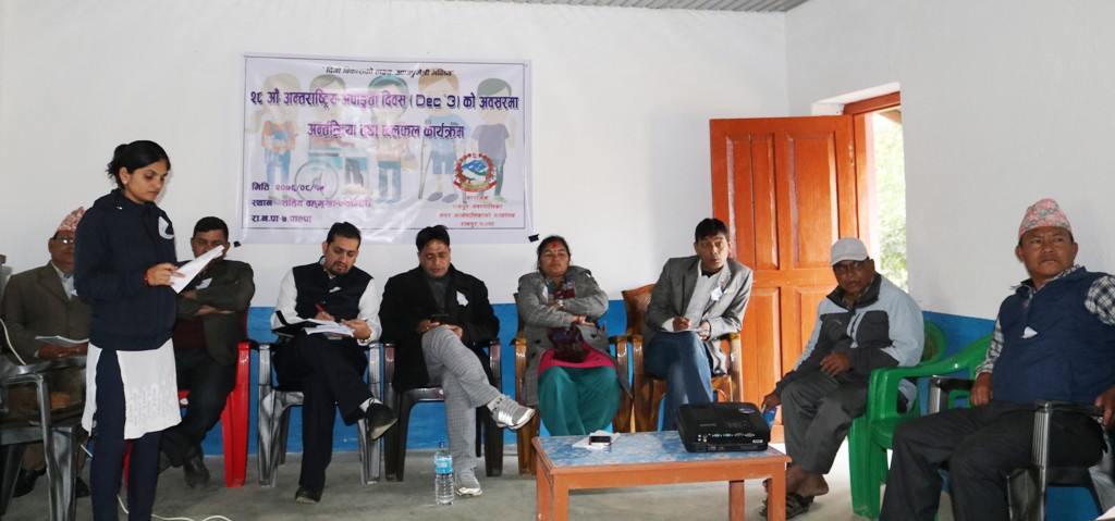 पाल्पा (रामपुर) अन्तराष्ट्रिय अपाङ्गता दिवसको अवसरमा पाल्पाको रामपुरमा जनप्रतिनिधी अपाङ्गता भएका व्यक्तिहरु विच अन्तरक्रिया तथा छलफल कार्यक्रम भएको छ । नगरपालिका भित्रका फरक क्षमता व्यक्तिहरुको आवश्यकता कसरी सम्बोधन गर्ने भन्ने विषयमा छलफल कार्यक्रम भएको हो ।